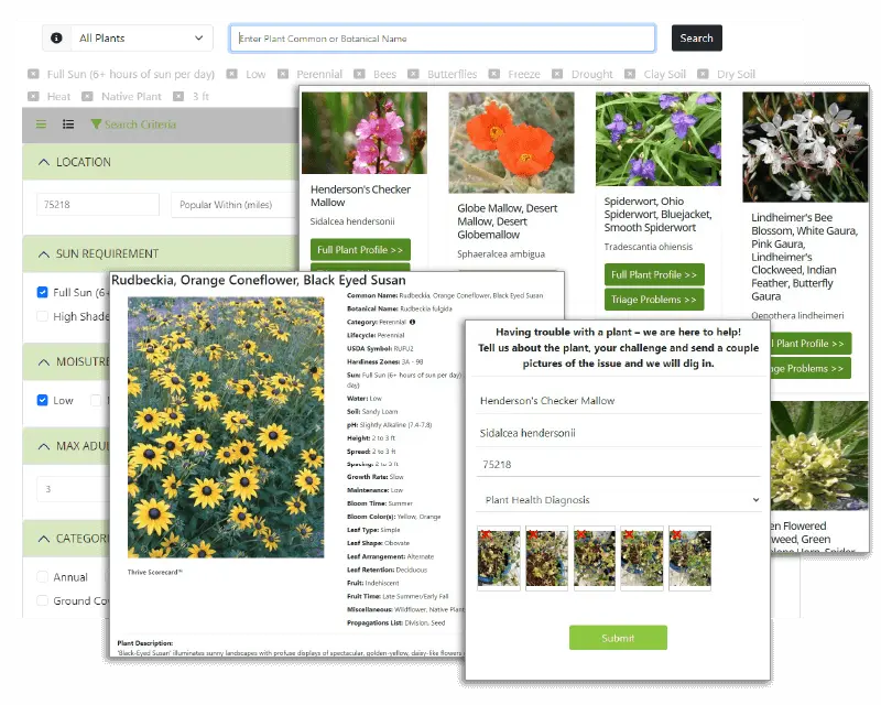 Our ‘Plant Search & Ask-an-Expert’ website widget offers your site visitors the rich ability to research and choose plants that work for their exact location, micro-climates and purpose. The widget also includes powerful AI-driven plant health analysis, diagnosis and remediation to uploaded pictures of 80 possible plant problems. The expert response is specific to the selected plant, precise location, planting conditions and time of year. It also includes our patented Thrive Scorecard® and Companion Plants tools to help your site visitors achieve higher levels of gardening success!